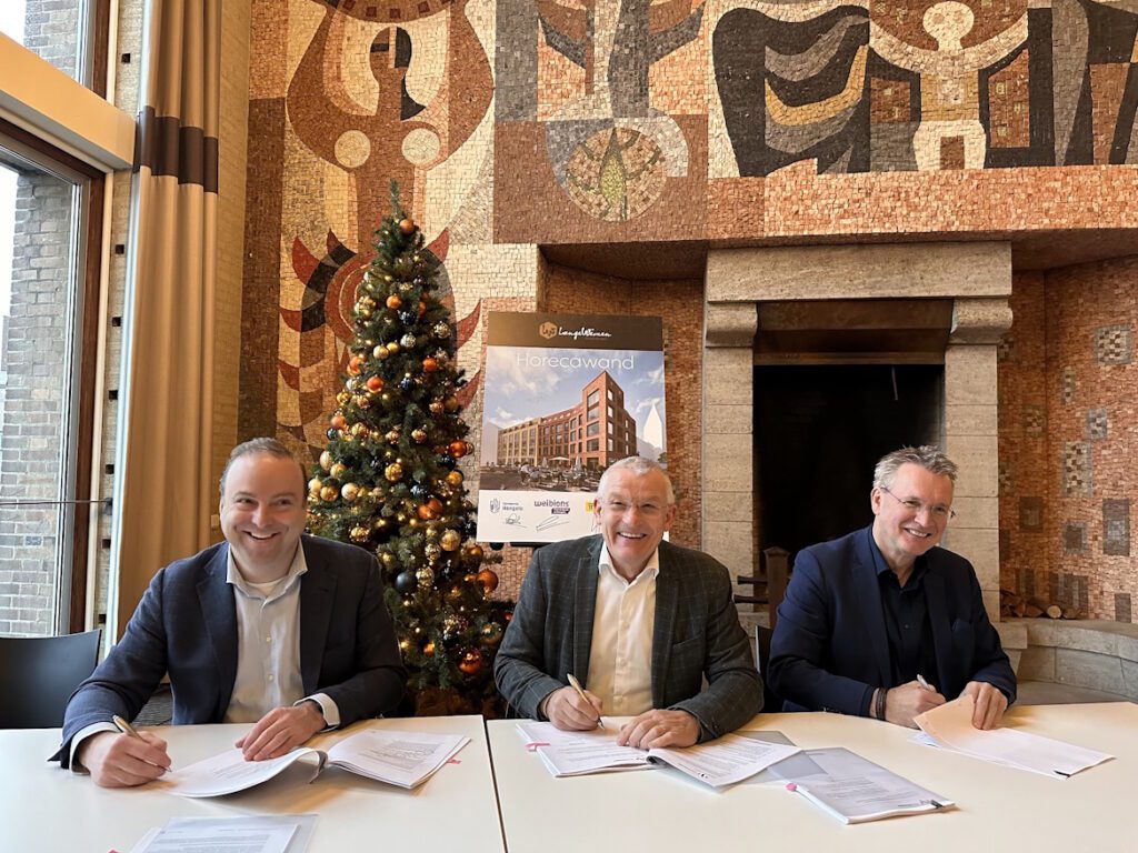 Horecaondernemer George ten Brummelhuis gaat investeren in de nieuwe horecawand Lange Wemen. Daarvoor zijn de handtekeningen gezet.